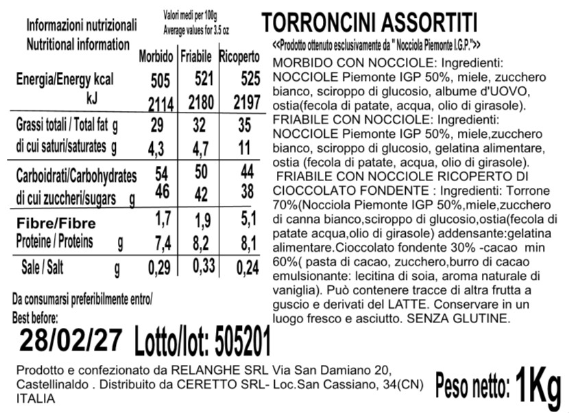 Un mix di Torroncini alle Nocciole, che celebra la tradizione dolciaria italiana con ingredienti di alta qualità. Realizzati con pregiate Nocciola Piemonte IGP, questi torroncini offrono gusto autentico e consistenze irresistibili.La box contiene tre varianti: morbido alle nocciole, delicato e avvolgente; friabile alle nocciole, croccante e ricco di gusto; friabile alle nocciole ricoperte di cioccolato, ancora più goloso grazie alla copertura intensa e vellutata.